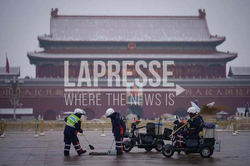 Workers clean at Tiananmen Square before the opening session of the National People's Congress (NPC) in Beijing, China, Thursday, March 5, 2026. (AP Photo/Vincent Thian)