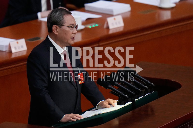 Chinese Premier Li Qiang speaks during opening session of the National People's Congress (NPC) in Beijing, Thursday, March 5, 2026. (AP Photo/Andy Wong)