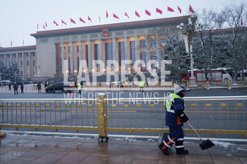 Workers clean outside the Great Hall of the People before the opening session of the National People's Congress (NPC) in Beijing, China, Thursday, March 5, 2026. (AP Photo/Vincent Thian)
