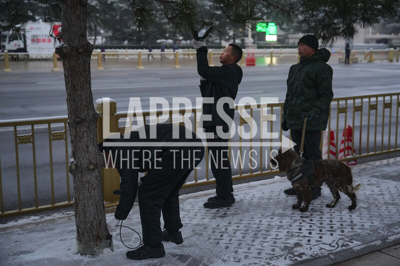Chinese Police and Special Force's bomb squad members use device to scan on trees near the Great Hall of the People before the opening session of the National People's Congress (NPC), in Beijing, Thursday, March 5, 2026. (AP Photo/Andy Wong)