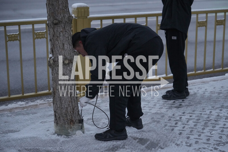 A Chinese Police and Special Force's bomb squad member uses a device to scan on a tree near the Great Hall of the People before the opening session of the National People's Congress (NPC), in Beijing, Thursday, March 5, 2026. (AP Photo/Andy Wong)