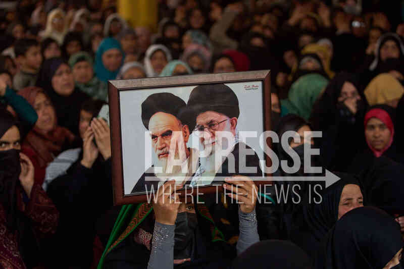 A Shiite Muslim woman holds a picture of Iran's Supreme Leaders, Ayatollah Ruhollah Khomeini and Ayatollah Ali Khamenei, during a protest against the killing of Ayatollah Ali Khamenei, in Budgam, northeast of Srinagar, Indian controlled Kashmir, Friday, March 6, 2026. (AP Photo/Dar Yasin)