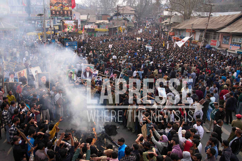 Shiite Muslims shout slogans as they burn effigies of President Donald Trump and Israeli Prime Minister Benjamin Netanyahu during a protest against the killing of Iran's Supreme Leader Ayatollah Ali Khamenei, in Budgam, northeast of Srinagar, Indian controlled Kashmir, Friday, March 6, 2026. (AP Photo/Dar Yasin)