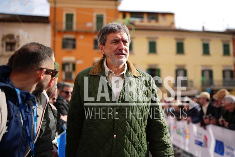 Marco Marsilio, President of the Abruzzo Region during the 213-kilometer Stage 4 of the Tirreno-Adriatico cycling race from Tagliacozzo to Martinsicuro - Italy,- Thursday, March 12, 2026. Sport - cycling . (Photo by Massimo Paolone/LaPresse)