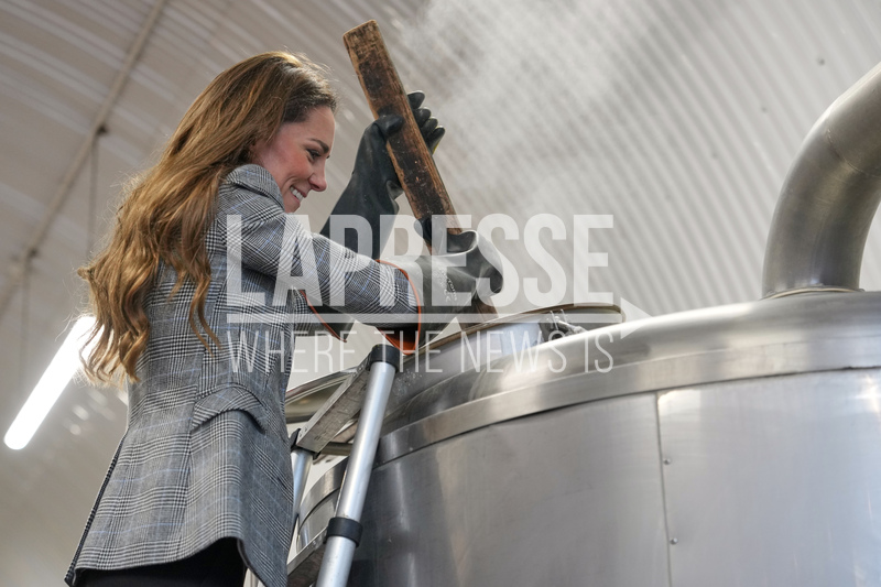 Britain's Kate, Princess of Wales, stirs in a brewhouse kettle as she tours the brewery during a visit of the Southwark Brewing Company at the Bermondsey Beer Mile in London, Thursday, March 12, 2026.(AP Photo/Kin Cheung, Pool)