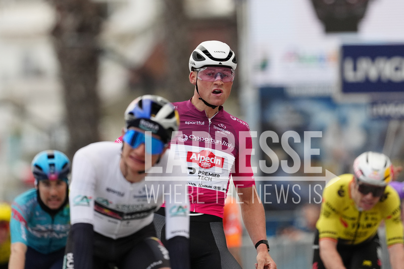 Van Der Poel Mathieu Of Alpecin-Premier Tech winner on the finish line during the 213-kilometer Stage 4 of the Tirreno-Adriatico cycling race from Tagliacozzo to Martinsicuro - Italy,- Thursday, March 12, 2026. Sport - cycling .