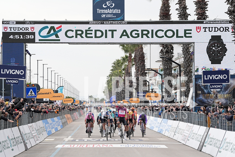 Van Der Poel Mathieu Of Alpecin-Premier Tech winner on the finish line during the 213-kilometer Stage 4 of the Tirreno-Adriatico cycling race from Tagliacozzo to Martinsicuro - Italy,- Thursday, March 12, 2026. Sport - cycling . (Photo by Marco Alpozzi/Lapresse)