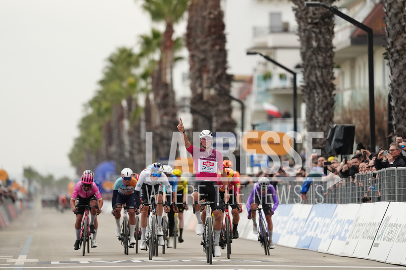 Van Der Poel Mathieu Of Alpecin-Premier Tech winner on the finish line during the 213-kilometer Stage 4 of the Tirreno-Adriatico cycling race from Tagliacozzo to Martinsicuro - Italy,- Thursday, March 12, 2026. Sport - cycling . (Photo by Massimo Paolone/LaPresse)