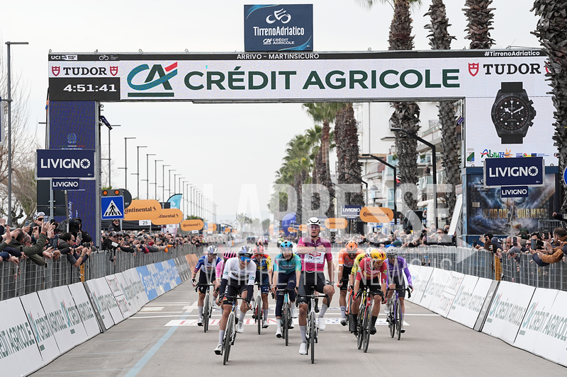 Van Der Poel Mathieu Of Alpecin-Premier Tech winner on the finish line during the 213-kilometer Stage 4 of the Tirreno-Adriatico cycling race from Tagliacozzo to Martinsicuro - Italy,- Thursday, March 12, 2026. Sport - cycling . (Photo by Marco Alpozzi/Lapresse)