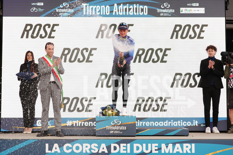 Van Der Poel Mathieu Of Alpecin-Premier Tech on the podium during the 213-kilometer Stage 4 of the Tirreno-Adriatico cycling race from Tagliacozzo to Martinsicuro - Italy,- Thursday, March 12, 2026. Sport - cycling . (Photo by Massimo Paolone/LaPresse)