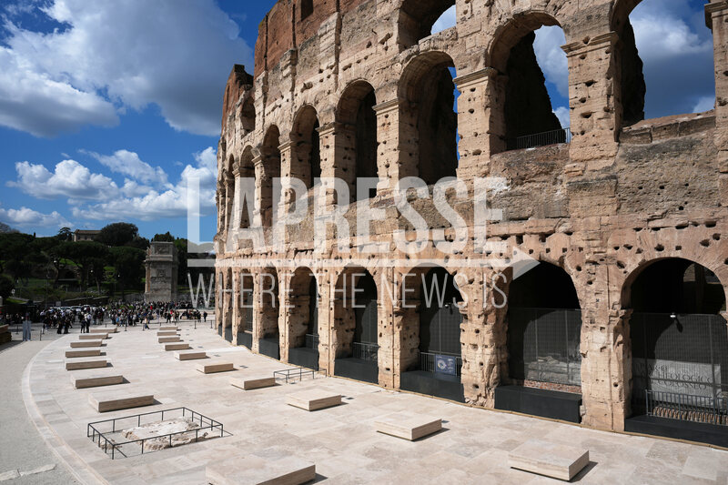Nuovo spazio esterno creato con marmo travertino intorno al Colosseo a Roma