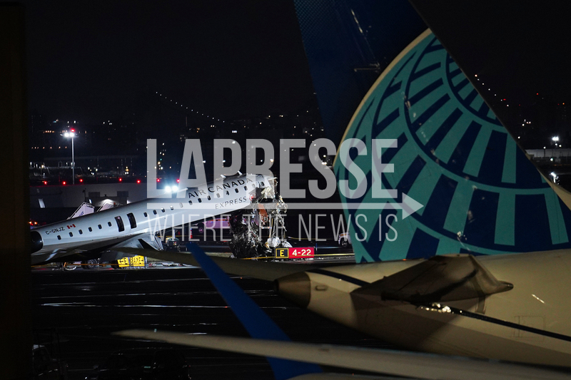 An Air Canada jet sits on the runway at LaGuardia Airport, Monday, March 23, 2026, after colliding with a Port Authority aircraft rescue and firefighting vehicle after landing in New York. (AP Photo/Ryan Murphy)