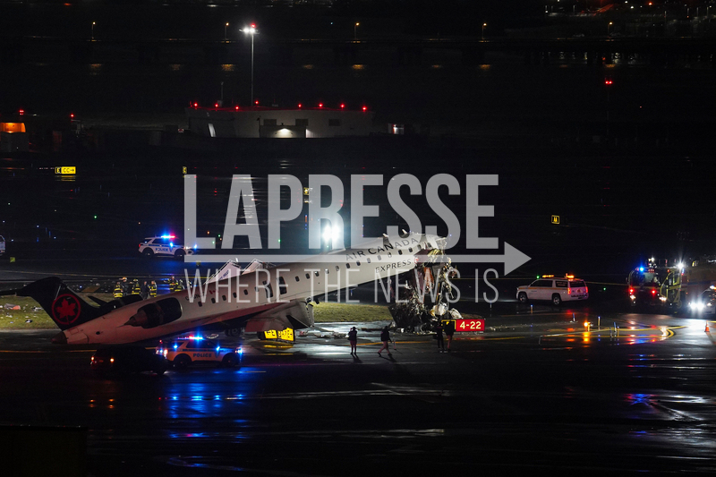 An Air Canada jet sits on the runway at LaGuardia Airport, Monday, March 23, 2026, after colliding with a Port Authority aircraft rescue and firefighting vehicle after landing in New York. (AP Photo/Ryan Murphy)