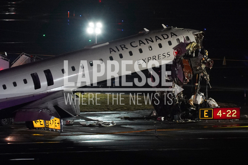 An Air Canada Jet sits on the runway at LaGuardia Airport, Monday, March 23, 2026, after colliding with a Port Authority aircraft rescue and firefighting vehicle after landing in New York. (AP Photo/Ryan Murphy)