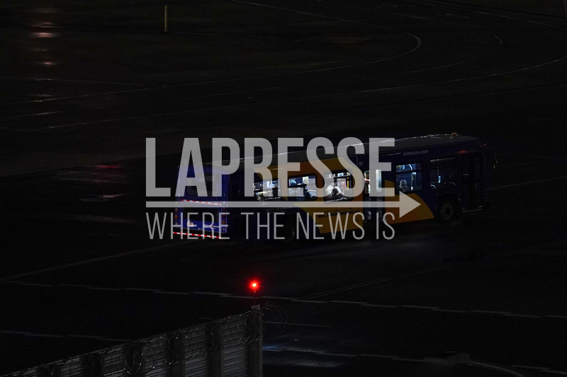 A Port Authority bus drives on the tarmac carrying people from the site where an Air Canada jet collided with a Port Authority flight rescue and firefighting truck at LaGuardia Airport, Monday, March 23, 2026, in New York. (AP Photo/Ryan Murphy)