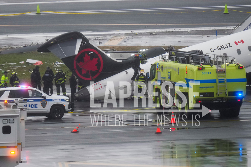 Firefighters and investigators examine the site, Monday, March 23, 2026, where an Air Canada jet came to rest after colliding with a Port Authority firetruck at LaGuardia Airport, after landing Sunday night in New York. (AP Photo/Seth Wenig)