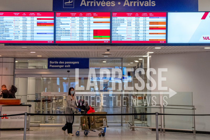 Flights from New York LaGuardia Airport are listed as canceled at Montreal-Pierre Elliott Trudeau International Airport in Montreal on Monday, March 23, 2026. (Christinne Muschi/The Canadian Press via AP)