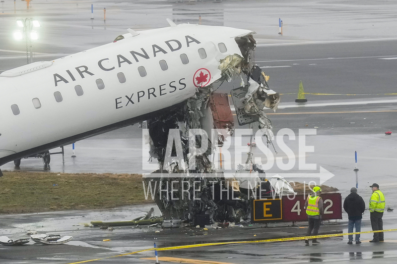 Officials investigate the site, Monday, March 23, 2026, where an Air Canada jet came to rest after colliding with a Port Authority firetruck at LaGuardia Airport, shortly after landing Sunday night in New York. (AP Photo/Seth Wenig)
