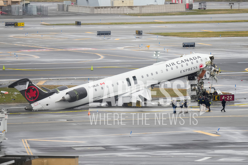 Officials with the National Transportation Safety Board investigate the site, Monday, March 23, 2026, where an Air Canada jet came to rest after colliding with a Port Authority firetruck at LaGuardia Airport, shortly after landing Sunday night in New York. (AP Photo/Seth Wenig)