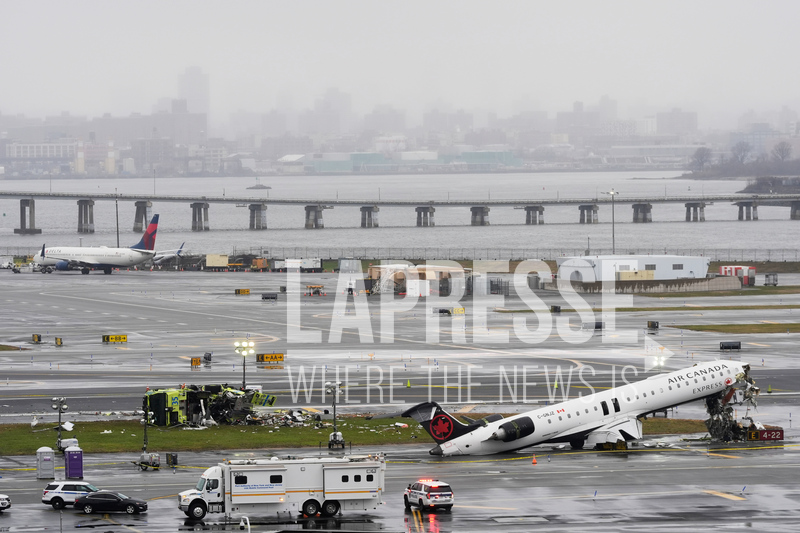 An Air Canada jet and Port Authority fire truck sit on the runway at LaGuardia Airport, Monday, March 23, 2026, after colliding with each other after the jet landed Sunday night in New York. (AP Photo/Seth Wenig)
