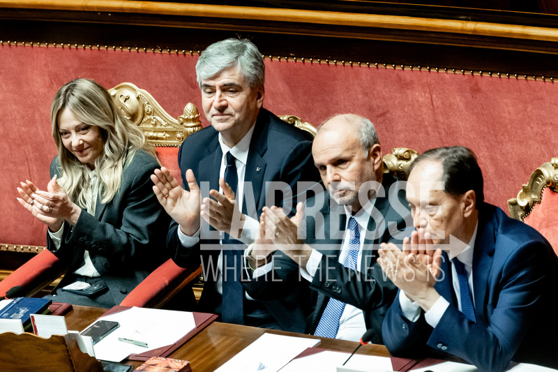 Il presidente del Consiglio Giorgia Meloni, Gianmarco Mazzi, Orazio Schillaci, Luca Ciriani in occasione dell’ Informativa del Presidente del Consiglio dei ministri sull'azione del Governo. Senato, Roma Giovedì 09 Aprile 2026 (photo by Mauro Scrobogna / LaPresse)
