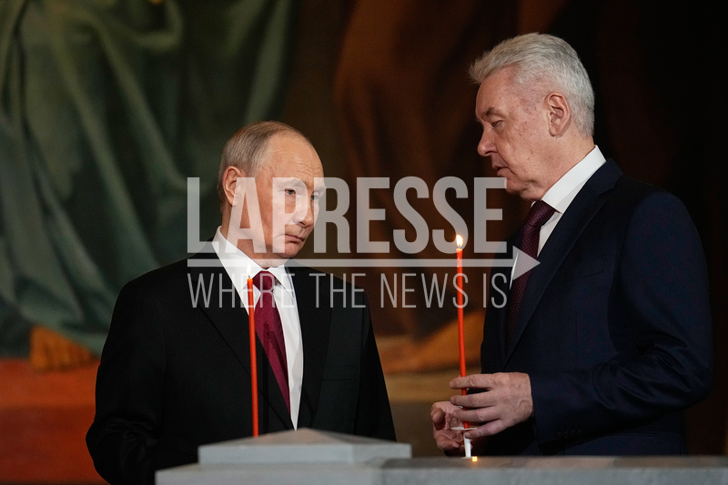Russian President Vladimir Putin, left, and Moscow Mayor Sergey Sobyanin attend the Orthodox Easter service at the Cathedral of Christ the Saviour in Moscow, Saturday, April 11, 2026. (AP Photo/Alexander Zemlianichenko, Pool)