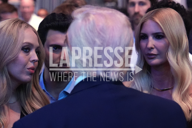 President Donald Trump talks with Tiffany Trump and her husband Michael Boulos, and Ivanka Trump at the UFC 327 at Kaseya Center, Saturday, April 11, 2026, in Miami. (AP Photo/Julia Demaree Nikhinson, Pool)