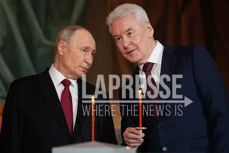 Russian President Vladimir Putin, left, and Moscow Mayor Sergey Sobyanin attend the Orthodox Easter service at the Cathedral of Christ the Saviour in Moscow, early Sunday, April 12, 2026. (AP Photo/Alexander Zemlianichenko, Pool)