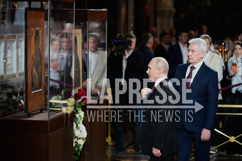 Russian President Vladimir Putin, front, accompanied by Moscow Mayor Sergey Sobyanin, right, crosses himself in front of the icons of the Virgin of Vladimir and Our Lady of Don during the Orthodox Easter service at the Cathedral of Christ the Saviour in Moscow, Saturday, April 11, 2026. (AP Photo/Alexander Zemlianichenko, Pool)