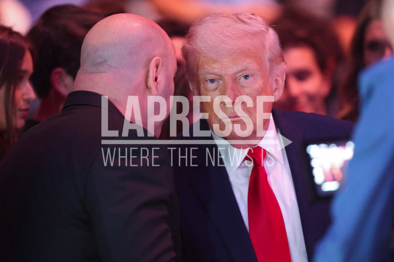 President Donald Trump talks with Dana White at UFC 327 at Kaseya Center, Saturday, April 11, 2026, in Miami. (Tasos Katopodis/Pool via AP)