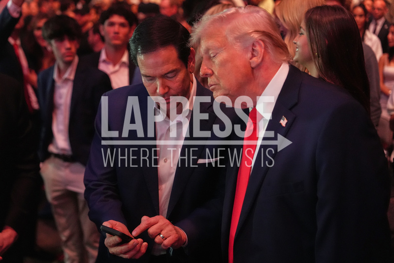 President Donald Trump talks with Secretary of State Marco Rubio at the UFC 327 at Kaseya Center, Saturday, April 11, 2026, in Miami. (AP Photo/Julia Demaree Nikhinson, Pool)