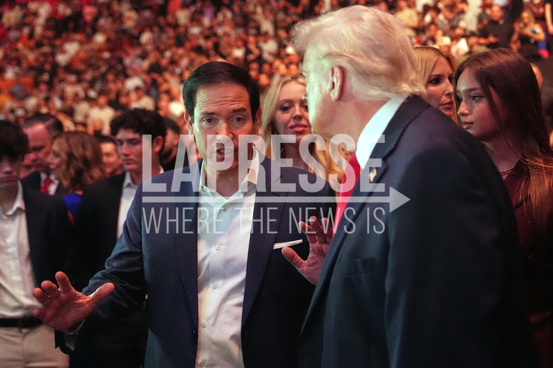 President Donald Trump talks with Secretary of State Marco Rubio at UFC 327 at Kaseya Center, Saturday, April 11, 2026, in Miami. (AP Photo/Julia Demaree Nikhinson, Pool)