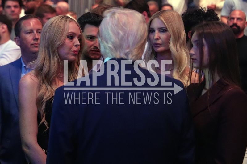 President Donald Trump attends the UFC 327 at Kaseya Center, Saturday, April 11, 2026, in Miami, as talks with Tiffany Trump and her husband Michael Boulos, and Ivanka Trump. (AP Photo/Julia Demaree Nikhinson, Pool)