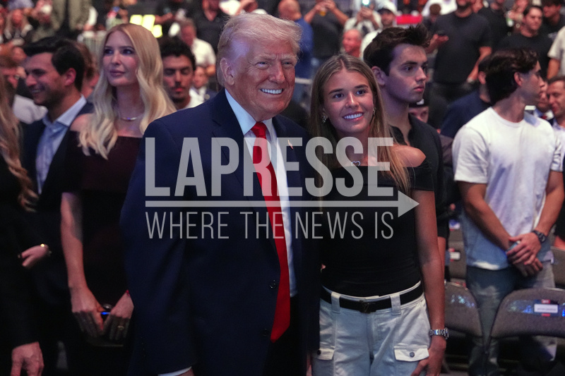 President Donald Trump stands with Kai Trump at the UFC 327 at Kaseya Center, Saturday, April 11, 2026, in Miami. (AP Photo/Julia Demaree Nikhinson, Pool)