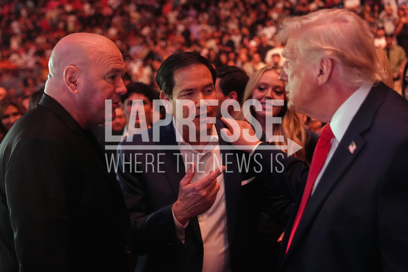 President Donald Trump talks with Secretary of State Marco Rubio and Dana White at the UFC 327 at Kaseya Center, Saturday, April 11, 2026, in Miami. (AP Photo/Julia Demaree Nikhinson, Pool)