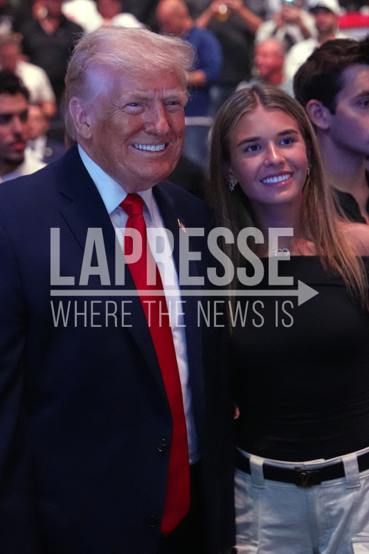 President Donald Trump stands with Kai Trump at the UFC 327 at Kaseya Center, Saturday, April 11, 2026, in Miami. (AP Photo/Julia Demaree Nikhinson, Pool)