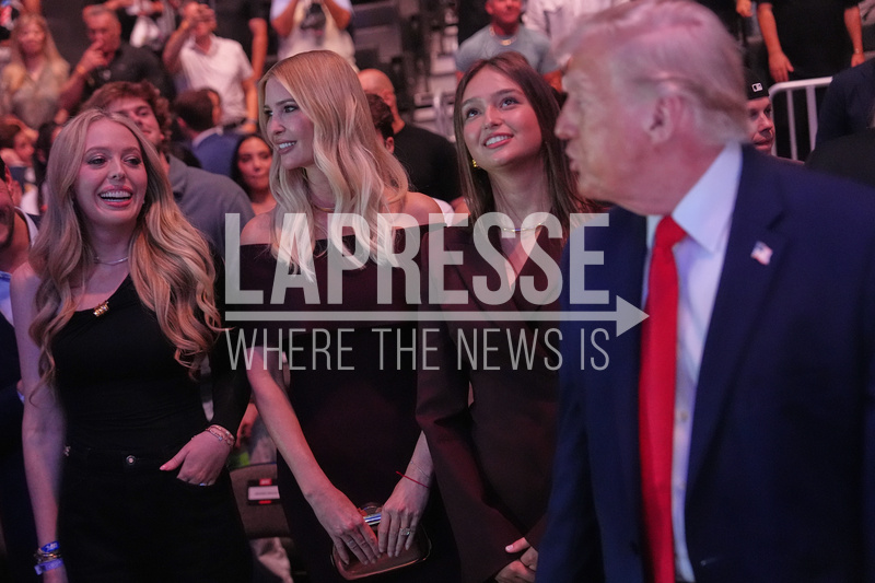 President Donald Trump attends the UFC 327 at Kaseya Center, Saturday, April 11, 2026, in Miami, with Tiffany Trump, Ivanka Trump and Arabella Kushner. (AP Photo/Julia Demaree Nikhinson, Pool)
