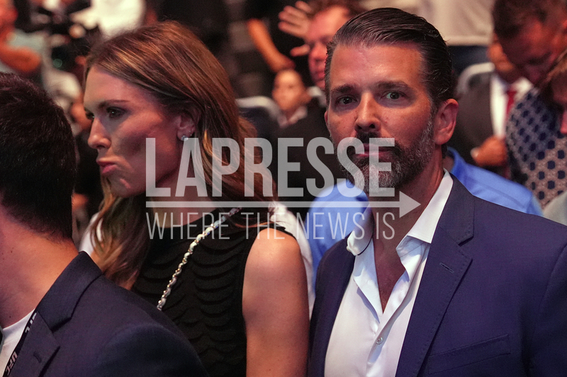 Donald Trump Jr., and Bettina Anderson attend UFC 327 at Kaseya Center, Saturday, April 11, 2026, in Miami. (AP Photo/Julia Demaree Nikhinson, Pool)