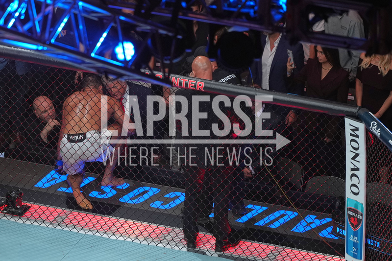 Paulo Costa talks with President Donald Trump after he won his fight by TKO at UFC 327 at Kaseya Center, Saturday, April 11, 2026, in Miami. (AP Photo/Julia Demaree Nikhinson)
