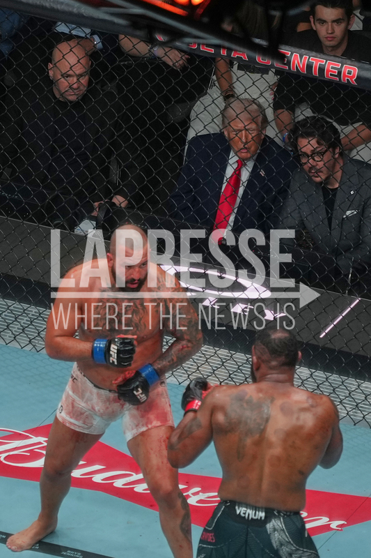 Dana White, President Donald Trump and Hunter Campbell watch a fight during UFC 327 at Kaseya Center, Saturday, April 11, 2026, in Miami. (AP Photo/Julia Demaree Nikhinson)