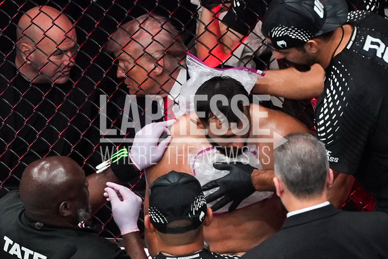 President Donald Trump talks with Dana White as fighter Dominick Reyes is attended to at UFC 327 at Kaseya Center, Saturday, April 11, 2026, in Miami. (AP Photo/Julia Demaree Nikhinson)
