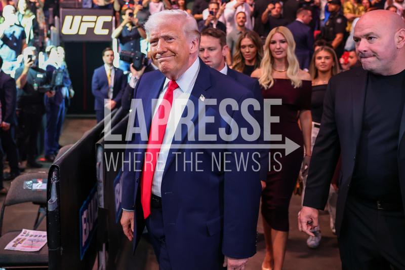 President Donald Trump attends UFC 327 at Kaseya Center, Saturday, April 11, 2026, in Miami, with Dana White. (Tasos Katopodis/Pool via AP)