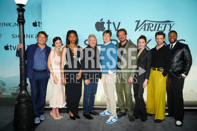 Ted McGinley, Lukita Maxwell, Jessica Williams, Harrison Ford, Bill Lawrence, Jason Segel, Christa Miller, Michael Urie and Luke Tennie arrive at an FYC event for "Shrinking" on Sunday, April 12, 2026, at Paramount Theatre in Los Angeles. (Photo by Jordan Strauss/Invision/AP)