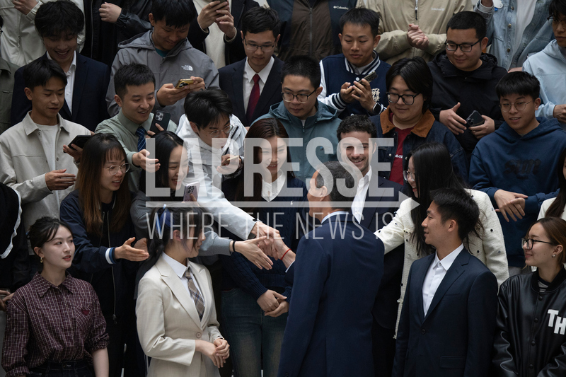 Spanish Prime Minister Pedro Sanchez, center, shakes hands with students after a group photo at Tsinghua University in Beijing, Monday, April 13, 2026. (Andres Martinez Casares/Pool Photo via AP)
