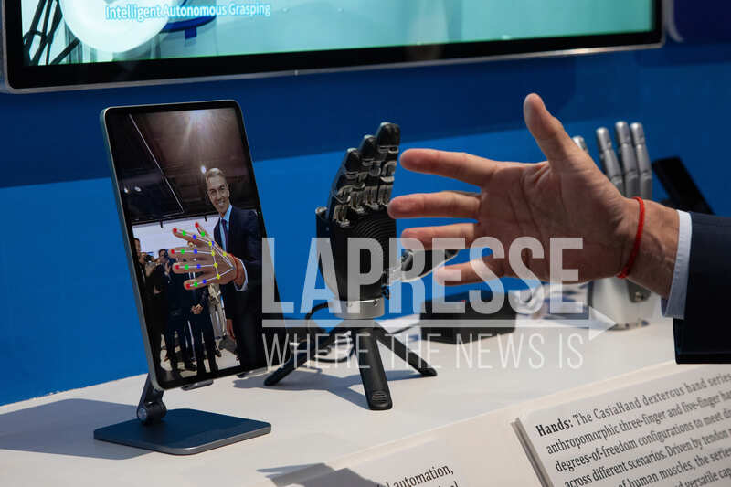 Spanish Prime Minister Pedro Sanchez checks a robotic hand during the visit to the University of Chinese Academy of Sciences in Beijing, Monday, April 13, 2026. (Andres Martinez Casares/Pool Photo via AP) Associate Press/ LaPresse Only Italy and Spain