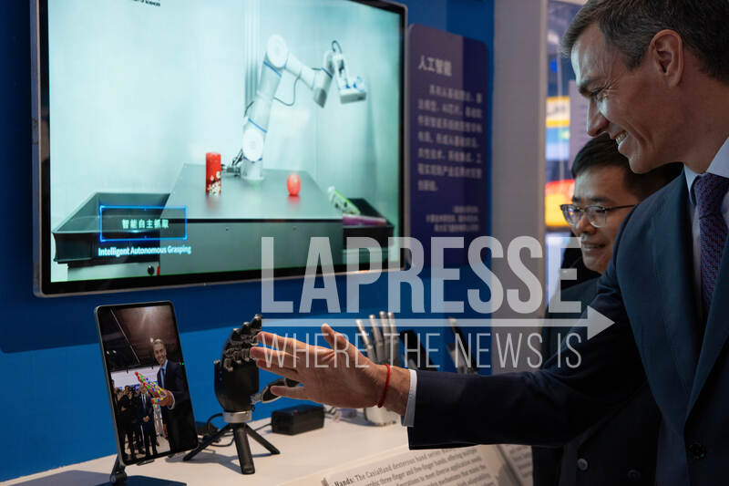 Spanish Prime Minister Pedro Sanchez checks a robotic hand during the visit to the University of Chinese Academy of Sciences in Beijing, Monday, April 13, 2026. (Andres Martinez Casares/Pool Photo via AP)