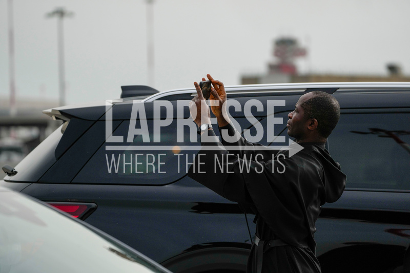 Nigerian Augustinian vice regent of the Papal Household, Fr. Edward Daniang Daleng photographs the flight carrying Pope Leo XIV taking off from Rome's Leonardo da Vinci-Fiumicino International Airport to Algiers, Monday, April 13, 2026, marking the start of an 11-day apostolic journey to Africa. (AP Photo/Gregorio Borgia)