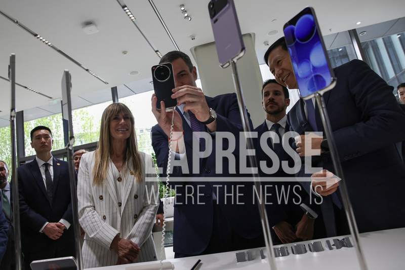 Spanish Prime Minister Pedro Sanchez, center, takes a photo with a Xiaomi smartphone with his wife Begona Gomez, and its founder Lei Jun, right, at the Xiaomi headquarters in Beijing, Monday, April 13, 2026. (Andres Martinez Casares/Pool Photo via AP)