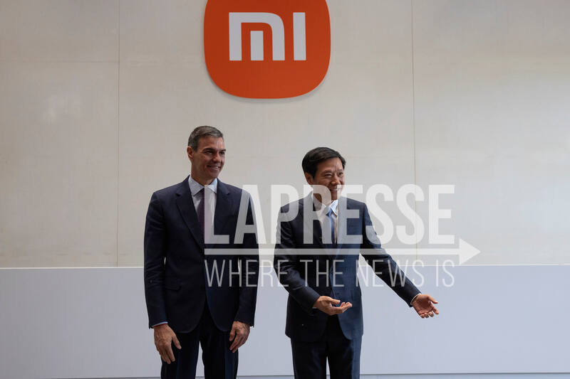 Spanish Prime Minister Pedro Sanchez, left, and Xiaomi founder Lei Jun pose for a photo at the Xiaomi headquarters in Beijing, Monday, April 13, 2026. (Andres Martinez Casares/Pool Photo via AP)
